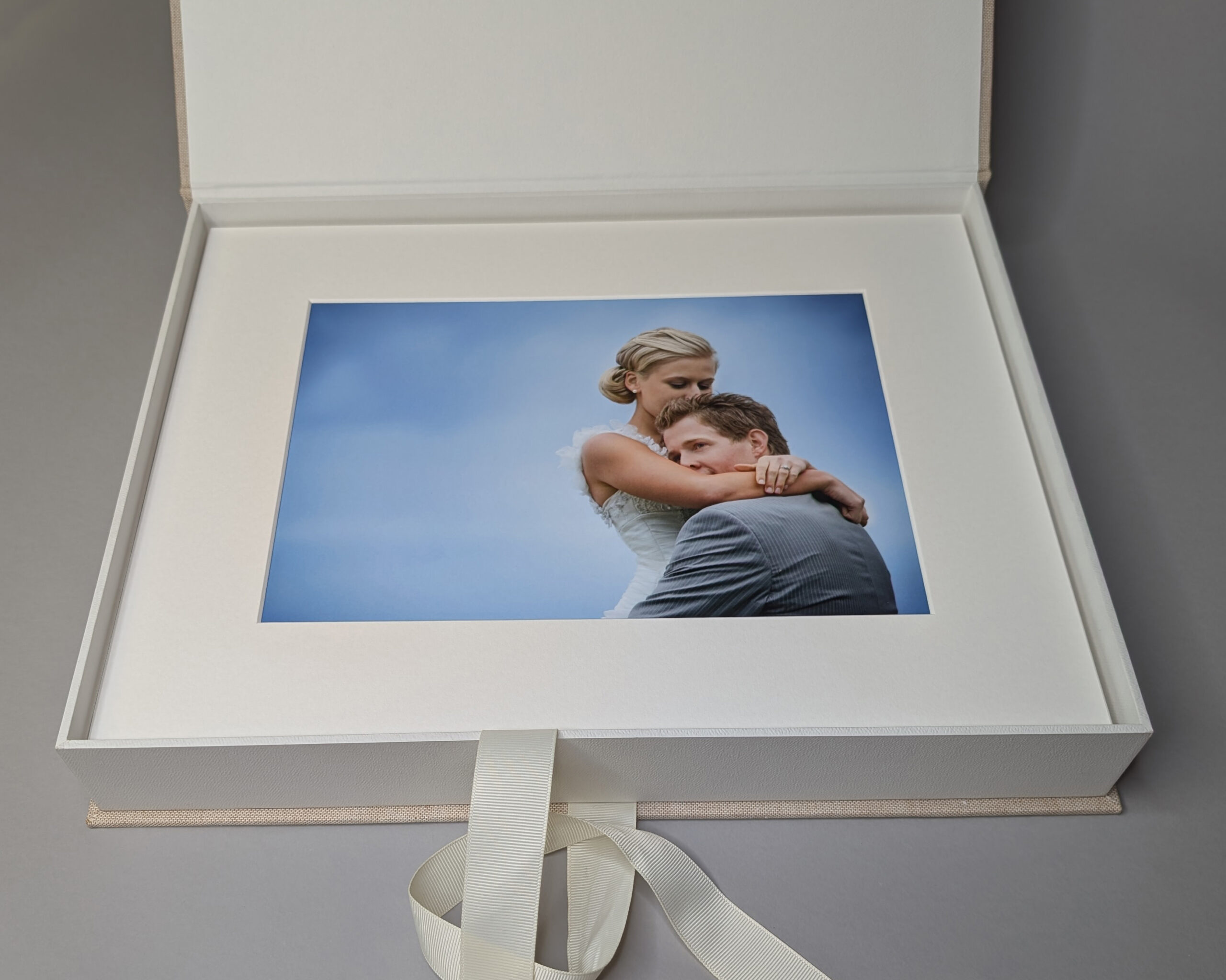 A perfect way to present mounted prints; boxes available in two sizes 8×10 and 11×14 in Linen Oatmeal or Stonewash both with matching ribbons and Personalised free of charge.
